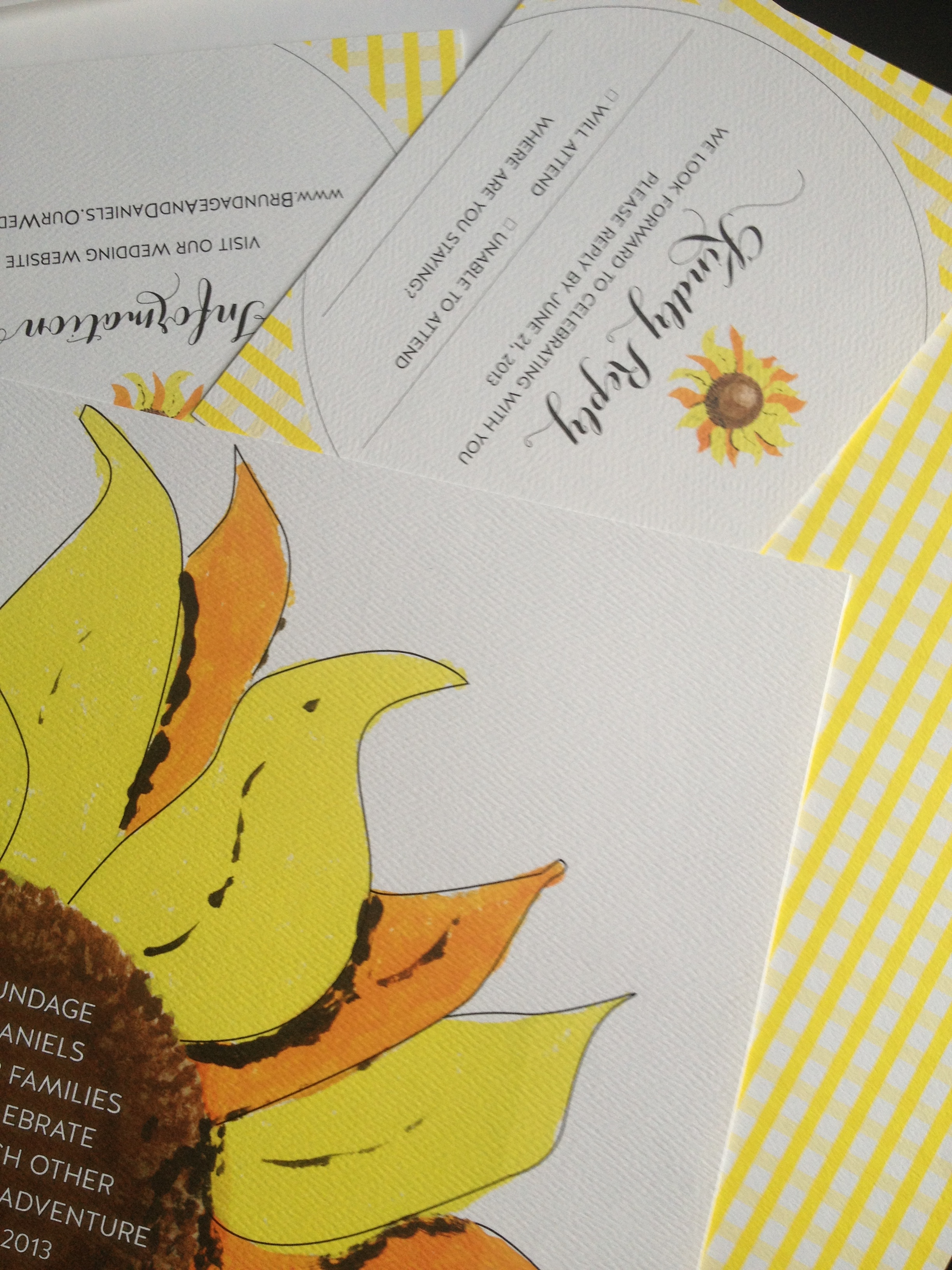 These bright and happy invitations feature a hand drawn sunflower. We’ll be featuring the coordinating program fans and jam jar tags in another post.