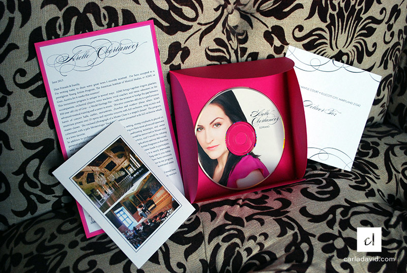 Arelle’s repertoire suite is a sample of the perfect presentation. All the components fit nicely into the pink pocket envelope which has a custom mailing label and seal.