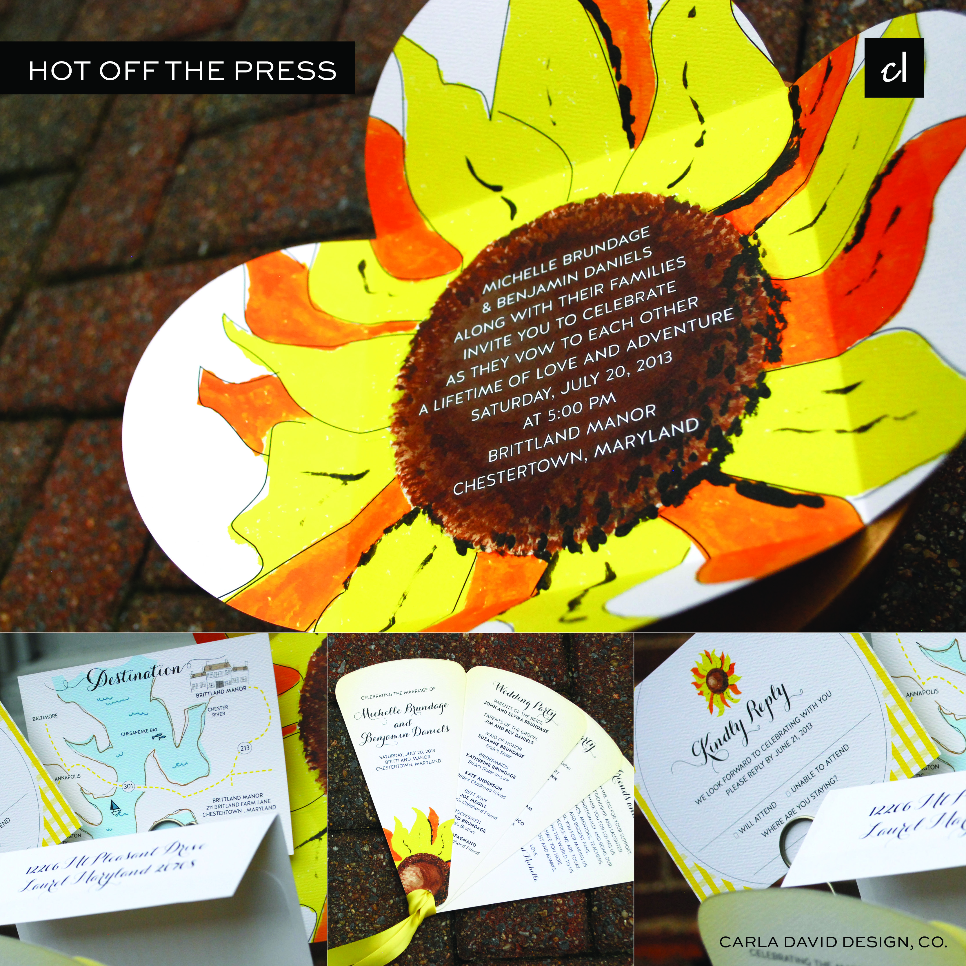 Remember the sneak peak we gave you of the cute hand drawn sunflower invitations? Well here they are with the coordinating custom map, program fans, and RSVP postcards. What a perfect summertime design!