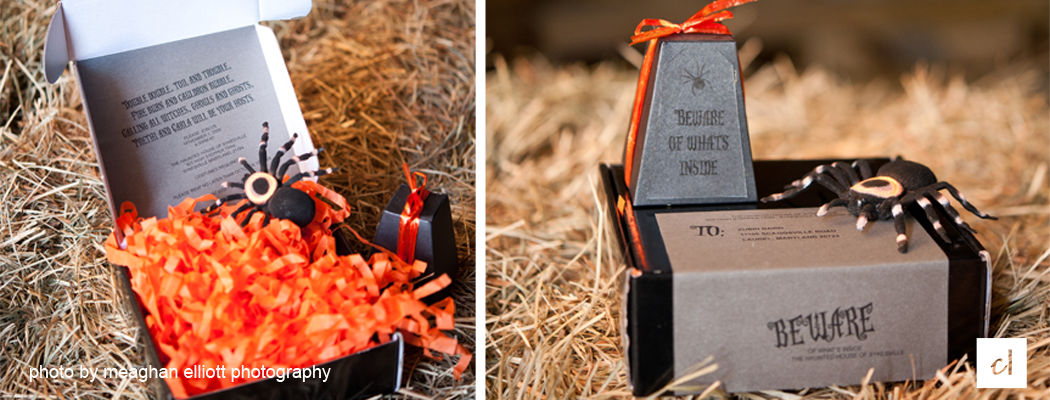 October is closer than you think! This is a custom invitation with a furry little spider inviting guests to a spooky haunted house Halloween party. Also shown is the coordinating favor box and tag.