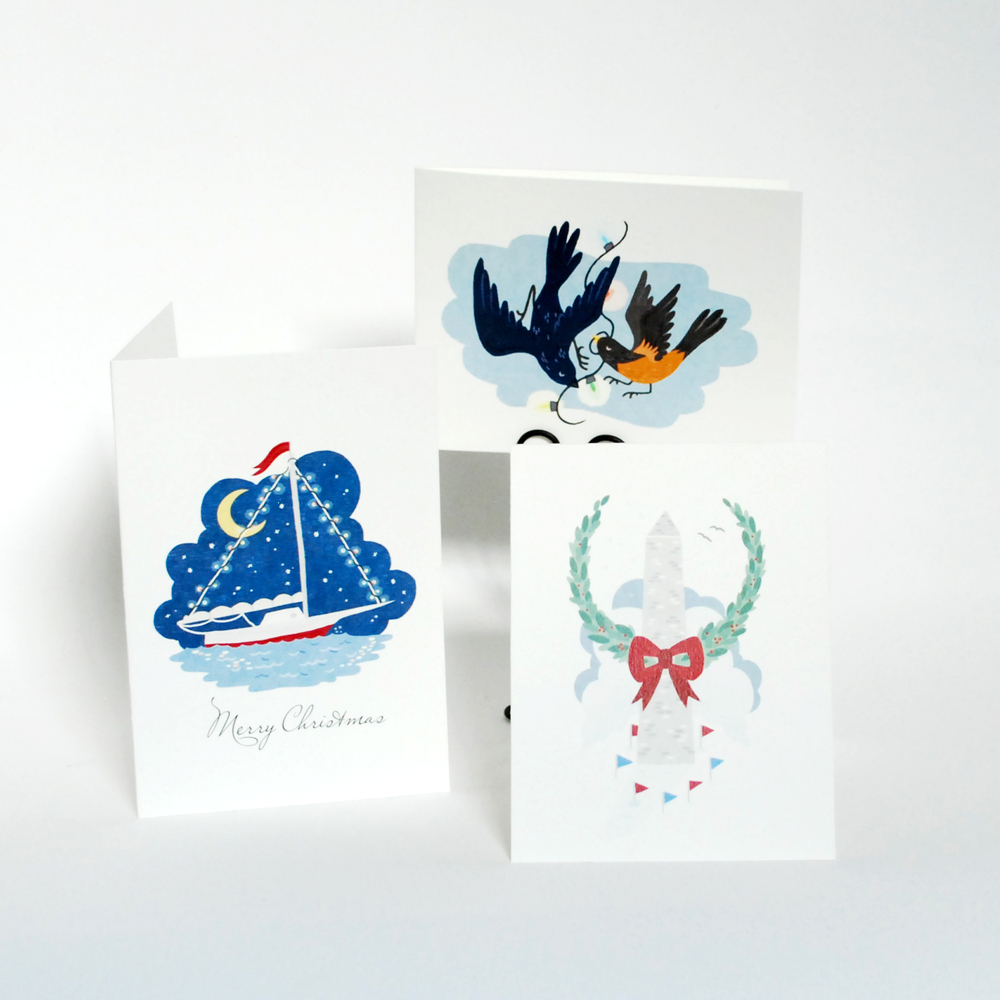 We are thrilled to present our new card collection for the upcoming holiday season. We had so much fun working with illustrator Bonnie Bladen to create these cards, that we could not wait to share them with you all! This special holiday card collection features icons from three of our local cities: Washington DC, Baltimore and Annapolis. They are available at our shop and 5% of the sales from these cards goes to The Birthday Party Project.